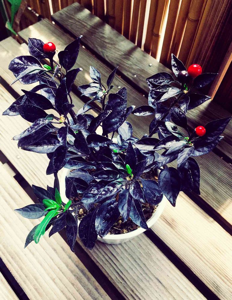 黒い葉に赤い実と黒い実。
