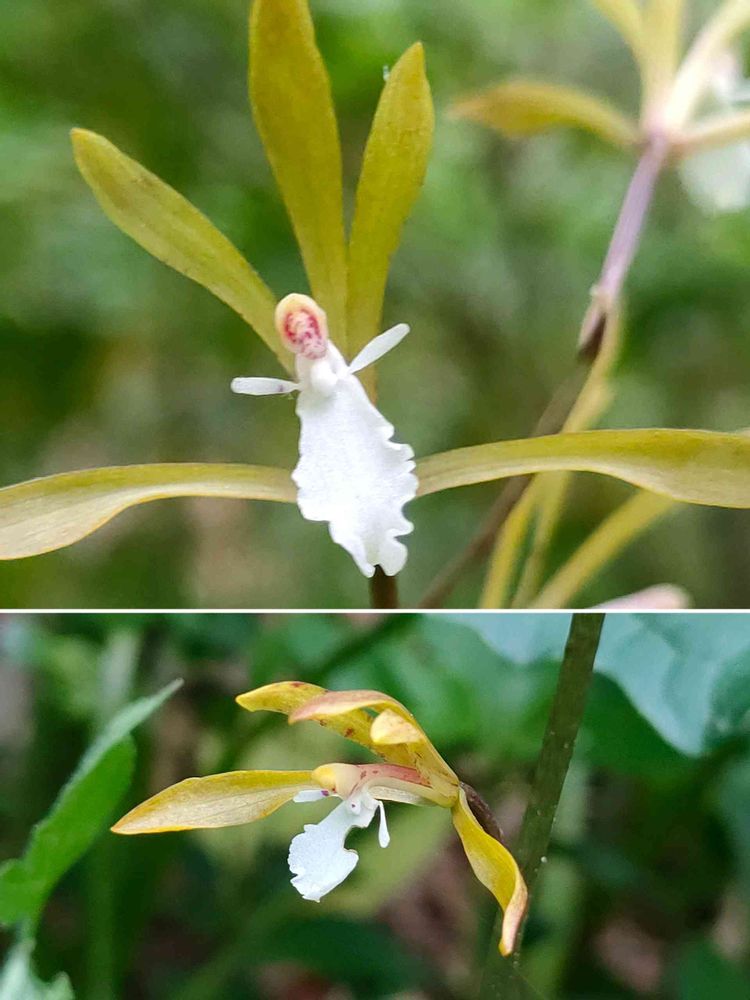✽がく片3個と側花弁はふつう紫色の斑点があるが、唇弁は白く先が3裂し、基部付近に側片がある