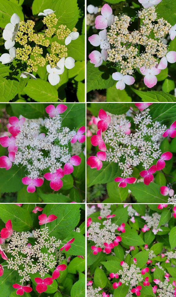 ガク(装飾花)が白く咲き始め次第に赤く(紅色)変わり、色の移り変わりが美しい。