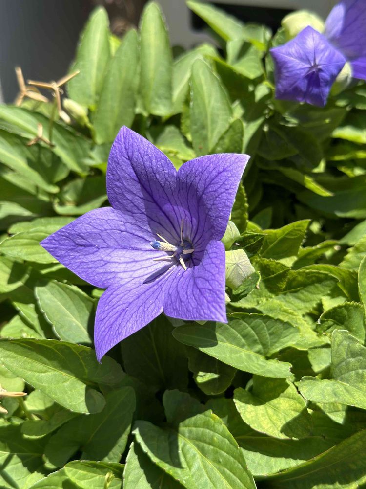 桔梗が咲きましたが。周りがスミレの葉に囲まれて少しおかしな感じになっています。