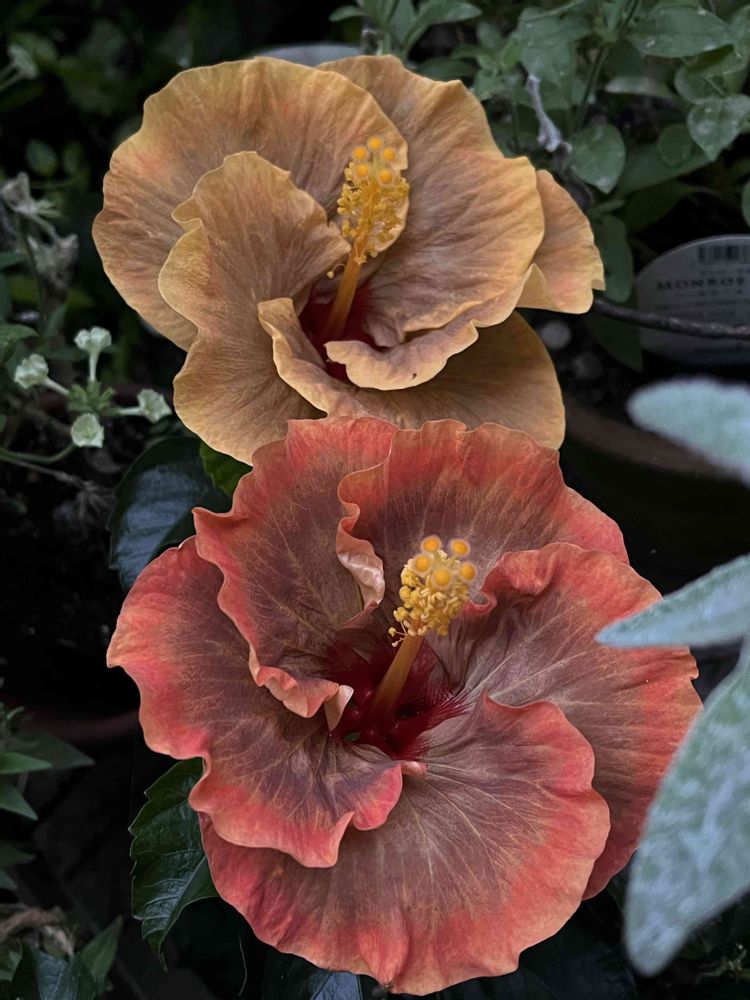 ハイビスカス ミステリーサークル🧡♣️手前のオレンジが濃い感じが咲き始めです✨この雰囲気たまらんですね😏💕