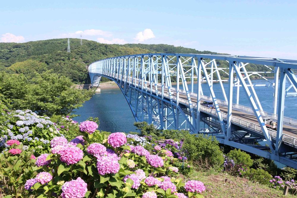 アジサイにバックに海と空と橋。全てがマッチしてますね。