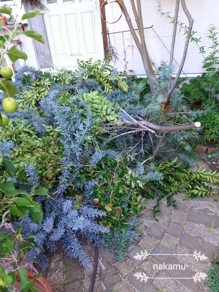 紫銀葉のミモザ、上から1.5メートルバッサリでした。✂あ~山吹き色の可愛いぽんぽんしたお花見れなくなるかな~。🌻台風で2回倒れたことがあるミモザ。台風対策の剪定らしいから何も言えない。🙊
