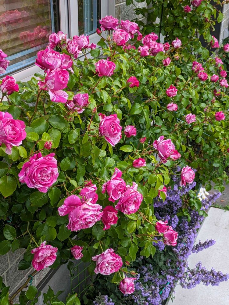 花火を思わせる濃いピンクに淡いピンクの絞りが入る、青リンゴね香りフランボワーズバニーユ。比較的コンパクトなつるバラ。昨日、一昨年とお客さんがきたけど、みんな去年よりスゴイ‼️今までで1番凄い✨💕全種類咲いてる〜😄と喜んでくれました。