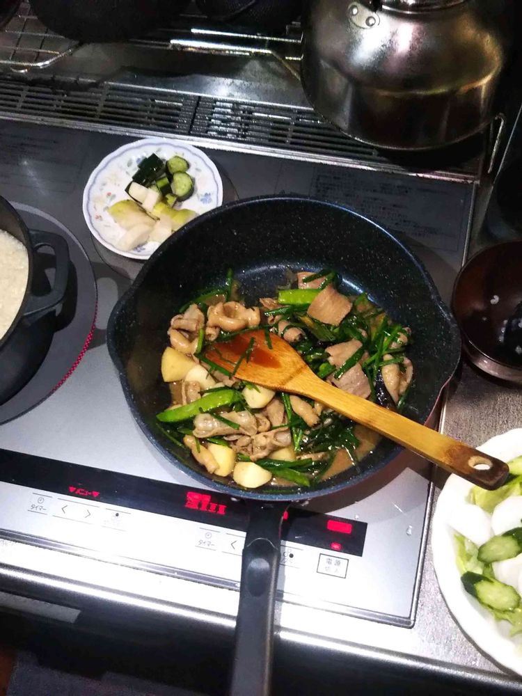 <地道投稿>茄子二本植えてます、小さいが最初の茄子収穫、こかぶは料理に二個収穫、新潟村上(山北富樫精肉店モツ)今日の👴の晩飯です🙇お粥は明日の朝の分まで😋つくりました。にらとキヌサヤも家産です😗 👵実家に里帰りだよ😪羽骨伸ばしてます👊👍️