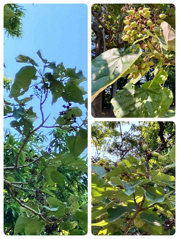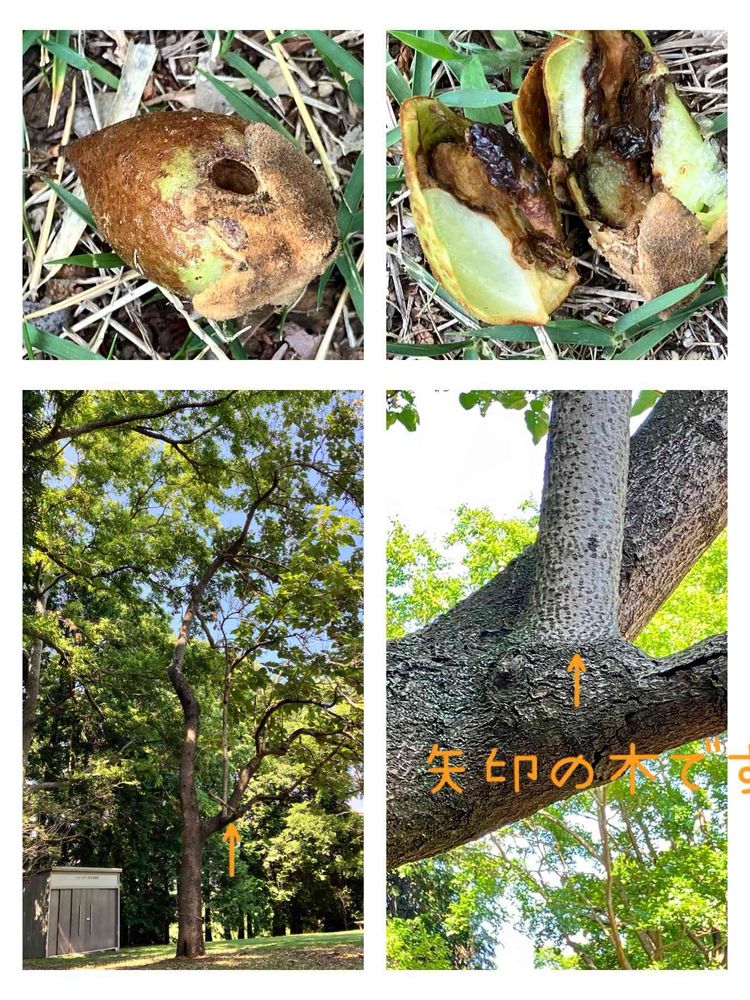 下に穴の空いた果実 爪で割ってみた指はベタベタ 木に新しい枝が垂直に(横に伸びてないのは早く太陽目指しいるのか?)