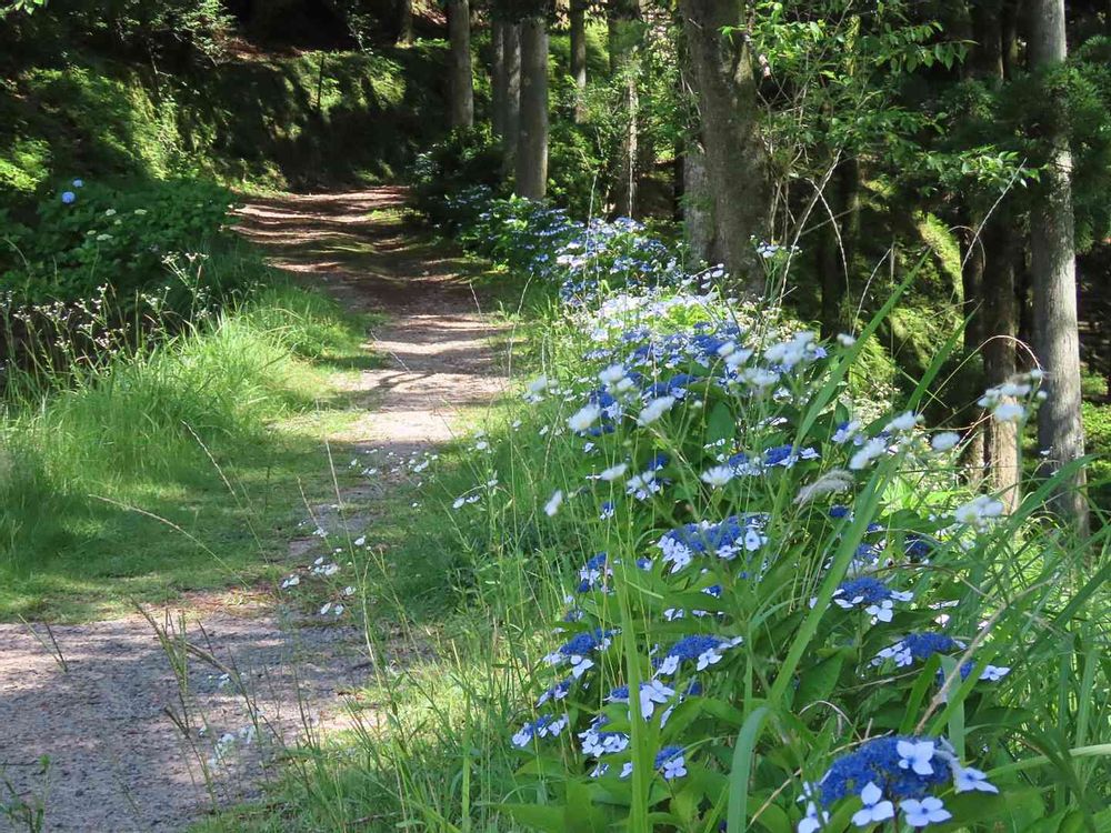 杉林の山路の紫陽花