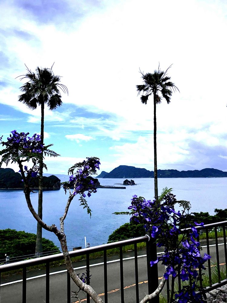 📝この写真画像は、宮崎県日南市南郷町に在る「道の駅南郷」の売店にある食事処の前からジャカランダの花とパーム椰子の木越しに眼下の景色を撮影したものデス🐶