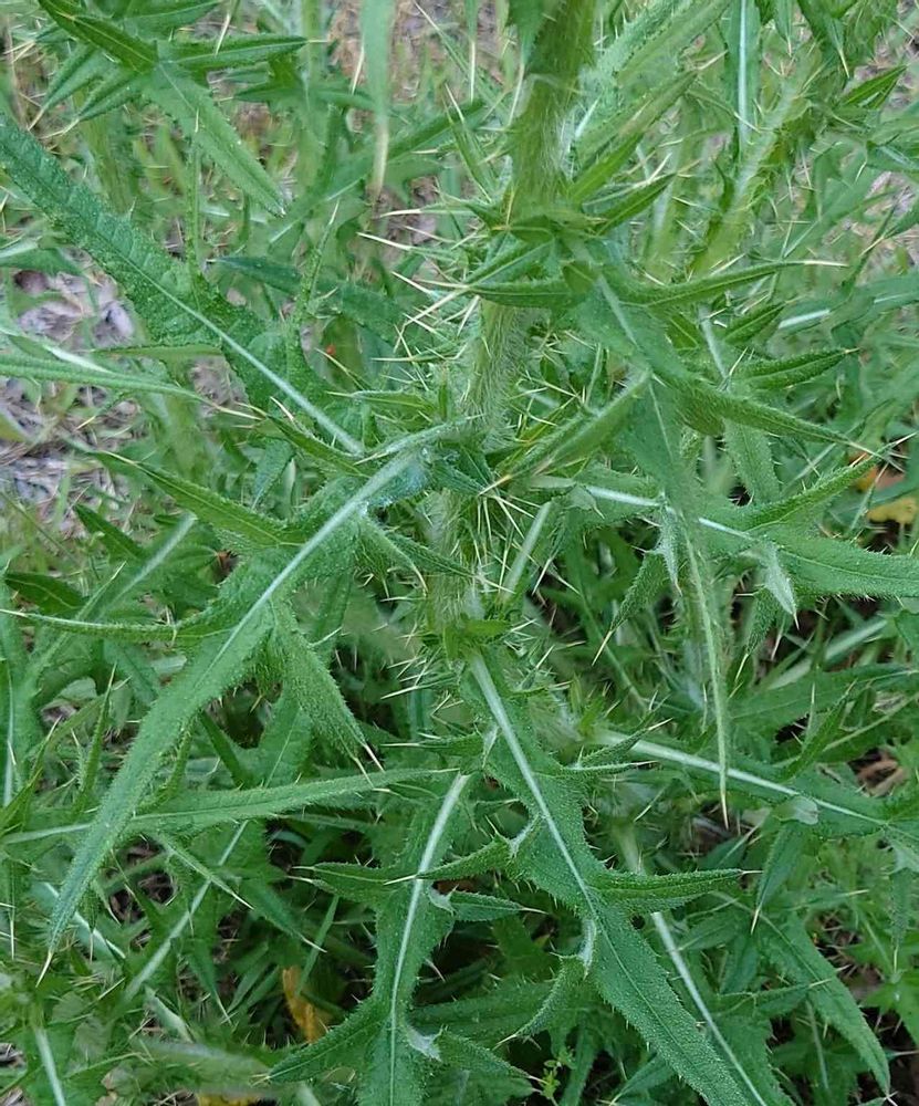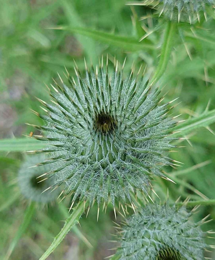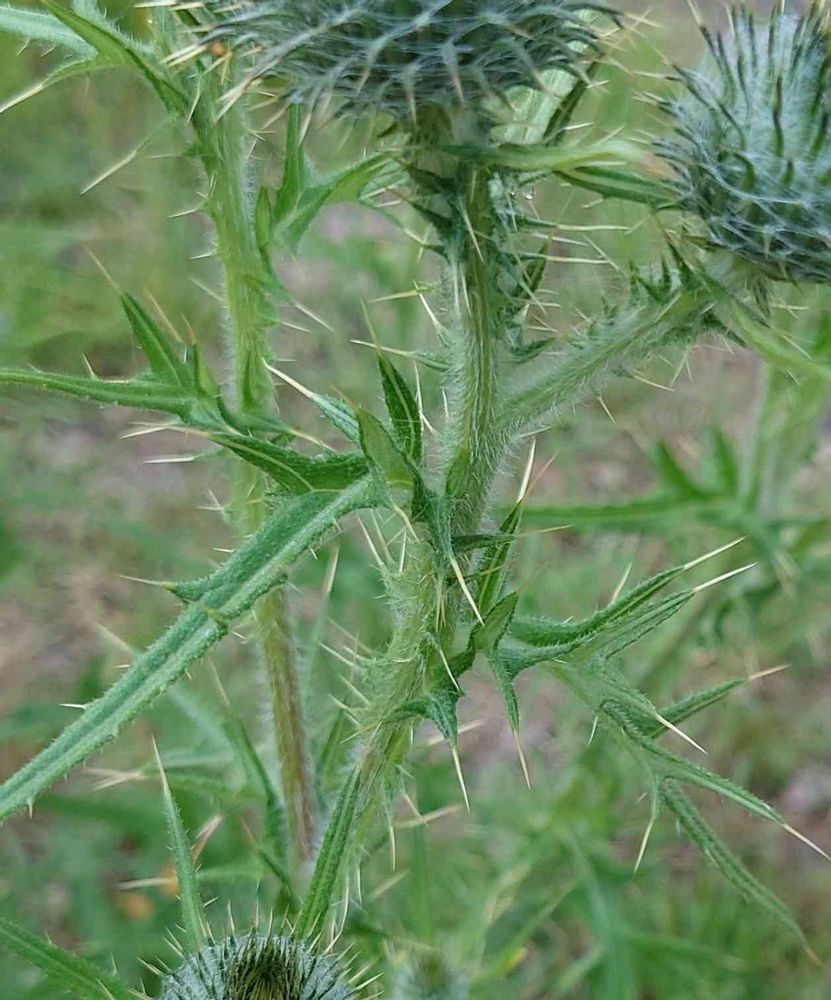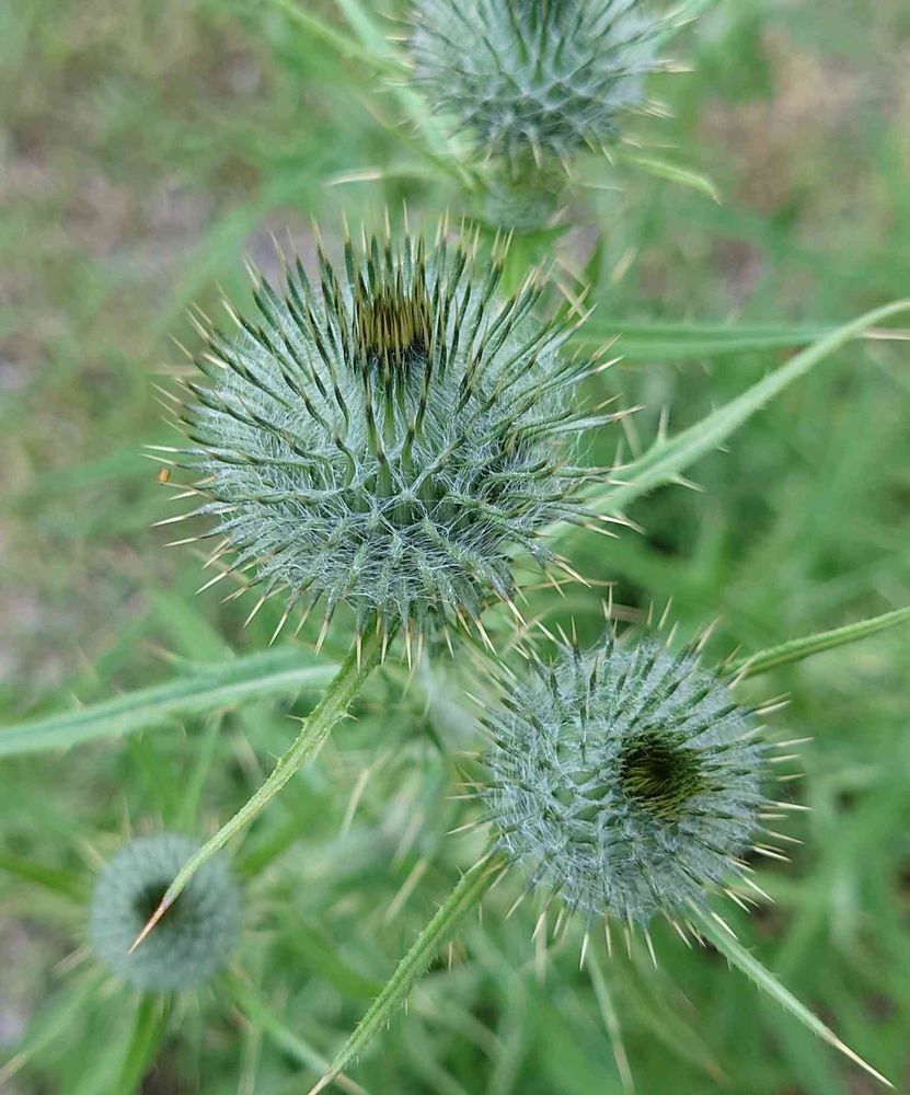 総苞や葉だけでなく、茎にも鰭状の鋭い棘をもちます