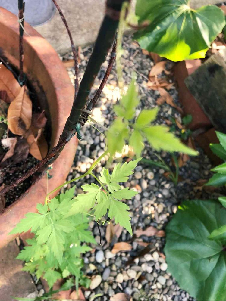 ちょうどよくあったクレマチスの鉢にからまりだしてます。