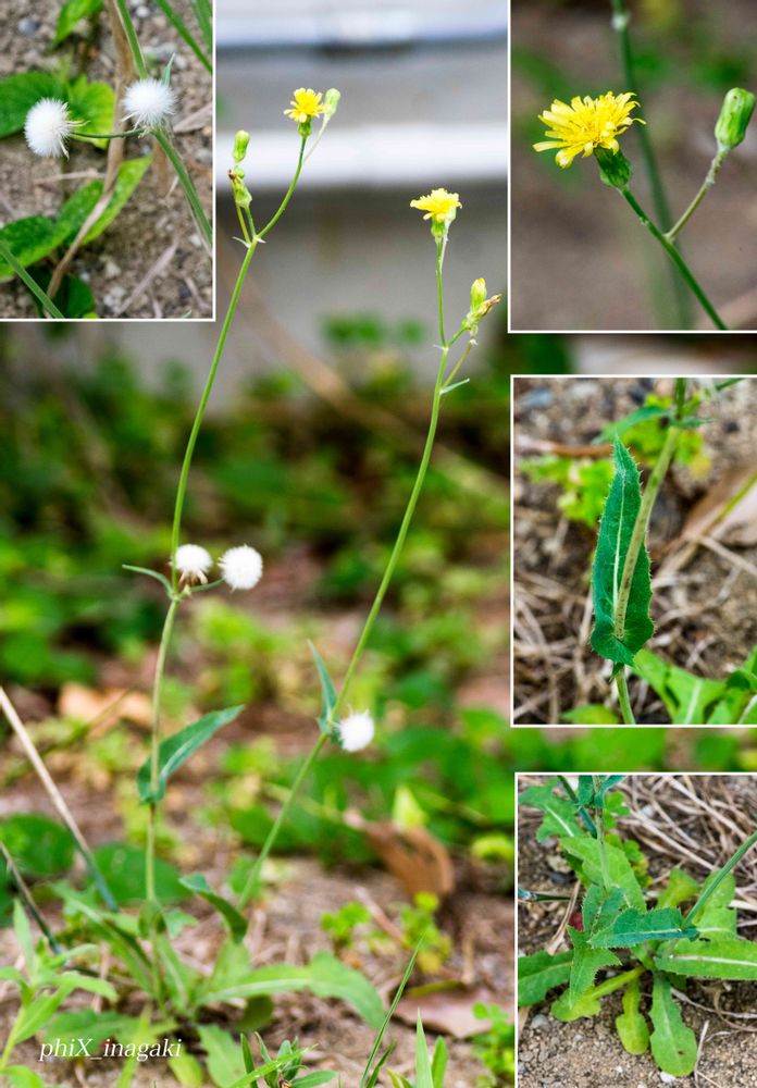 花は直径は1.5cmほどと小さく(右上),花柄に腺毛は見当たりません。中間の葉は茎を巻いていてノゲシの特徴があります(右中)。地上近くの葉が変わっていておしゃもじ型(右下)ですが,切れ込みが弱い個体と考えると一段上の葉が切れ込みのあるタイプとも考えられます。単独で咲いていて周りに同じ種類が無いのでこれらが個性であるのか判りません。総合的にノゲシかなあ,と思っております。よろしければ意見交換をお願いします。