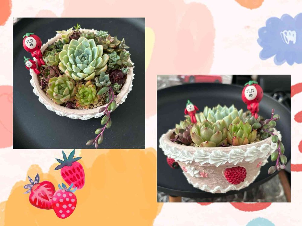いちごケーキの鉢に多肉ちゃんの寄せ植え🍓