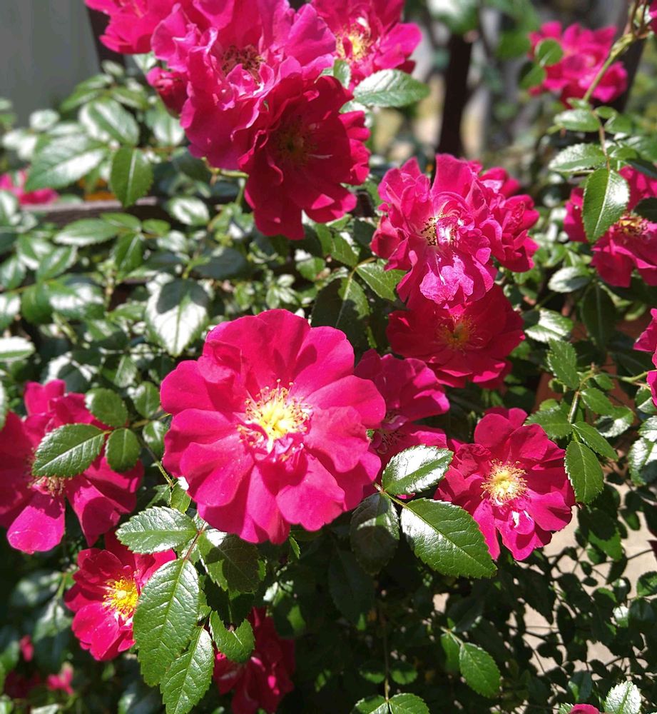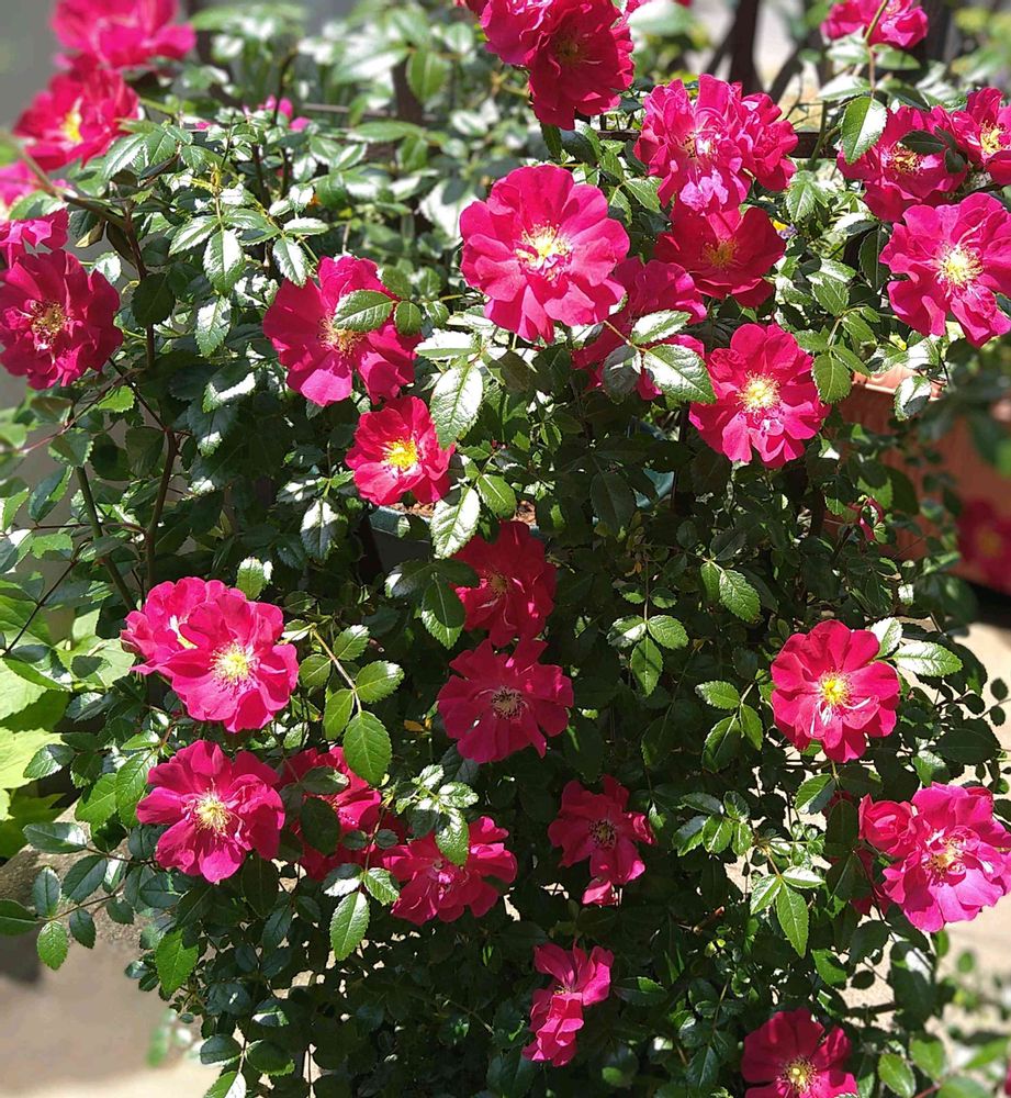 アレグリアスが満開になりました。赤というより濃いピンクかな…🌹ミニのつるバラ