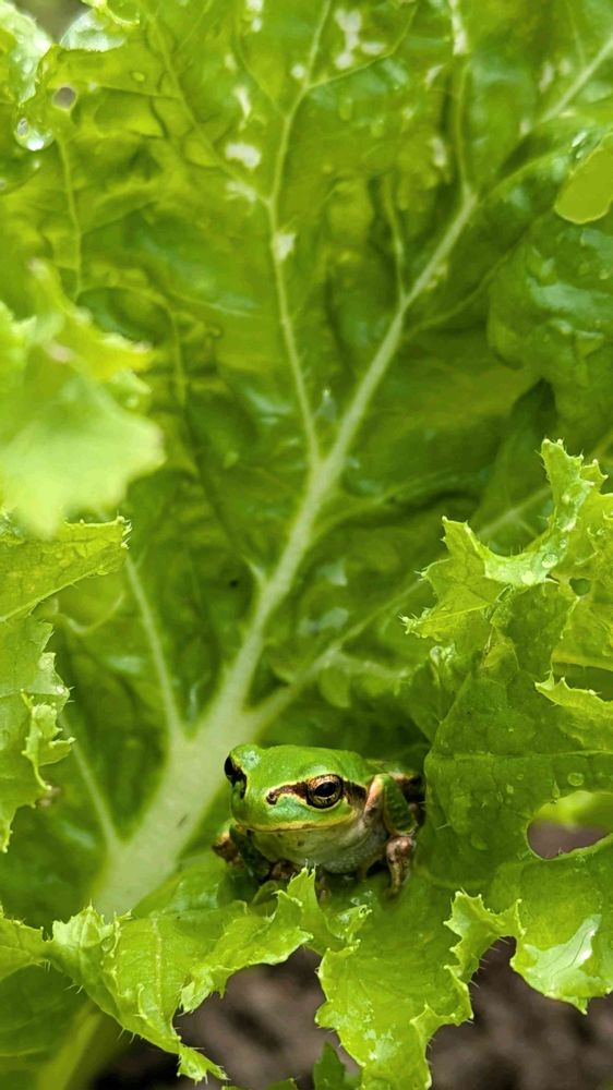 今朝は菜っ葉の中にいたので緑色だった🐸🎶