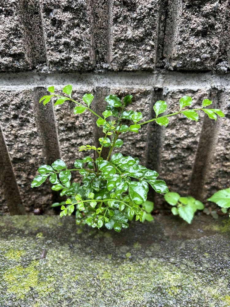 05月28日、近所の公園の花壇の足元、硬いコンクリートの隙間から芽吹いた🌱はようやくシマトネリコらしくなってきた。雨上がりに葉っぱがキラキラ(ღ✪v✪)