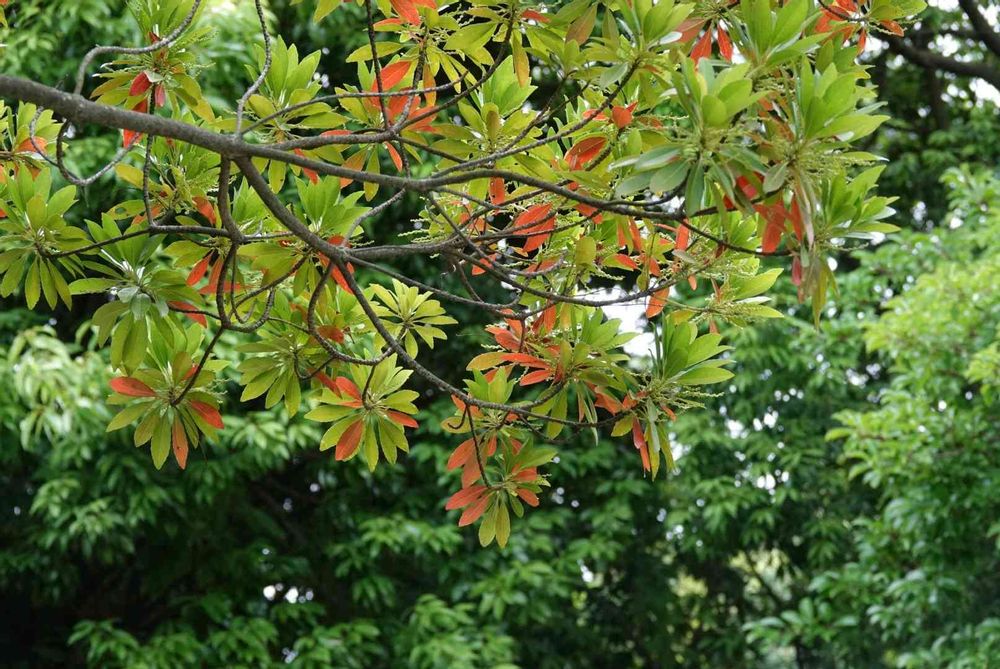 このホルトノキはほぼ一年中紅い葉を少しずつ落とし代わる。