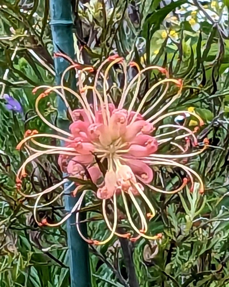 よその畑の中で咲くグレビレアピーチアンドクリーム初めて見るお花です👀