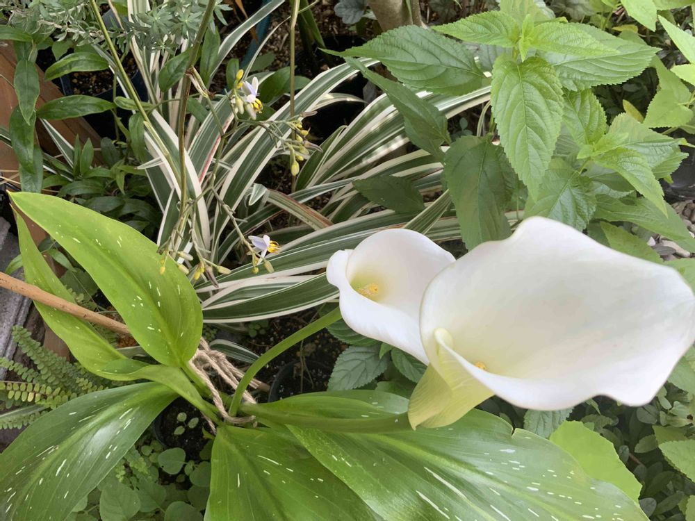 こんなに真っ白なカラーが咲き お連れして良かった、赤紫のカラーはあるんですが白はなかったんです♪