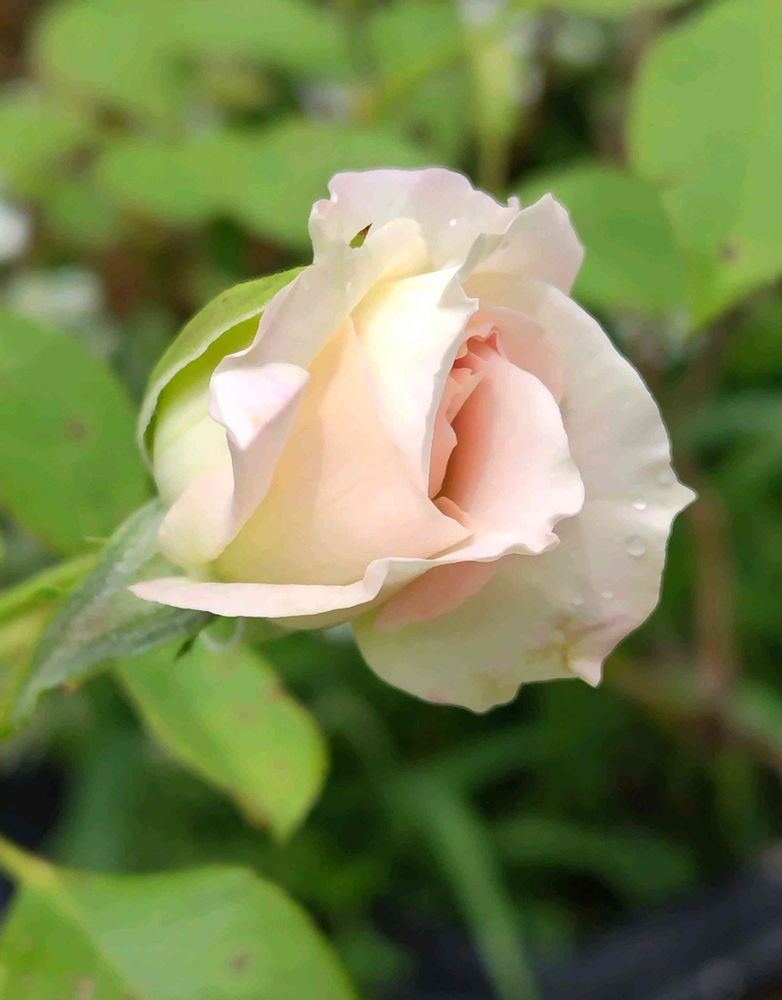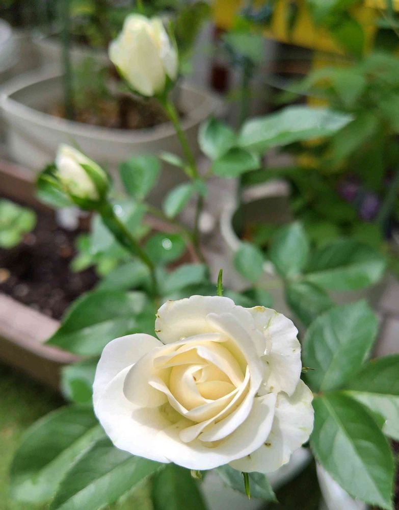 ②お隣さんにお願いして挿し木して貰ったバラ。幾つかお願いしてたのでどんなお花が咲くのか楽しみでしたが、真っ白なかわい子ちゃんでした❇️🤍❇️