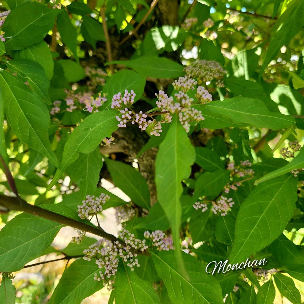 夏~秋には濃紫になります。今の時期はこんなソフトな色だったとは👀ちょっと日陰の枝を。