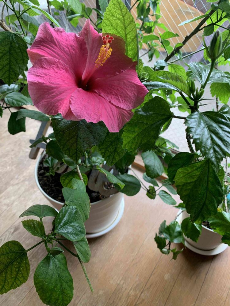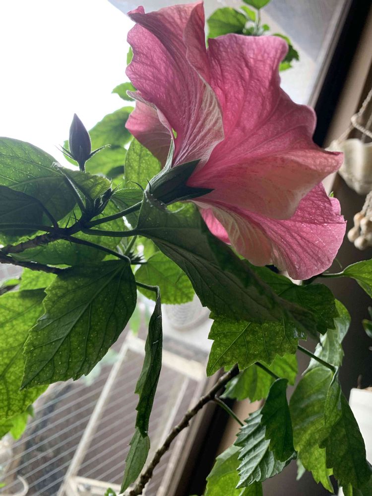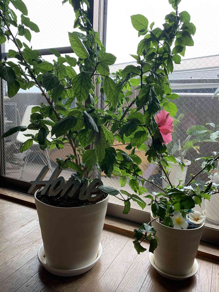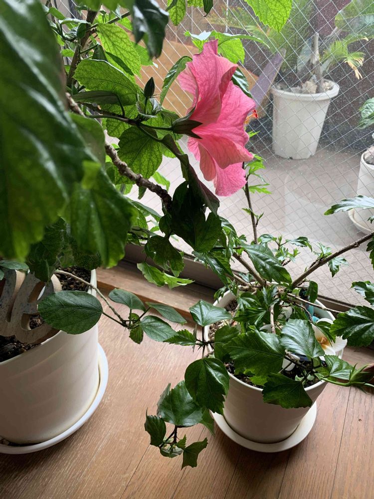 ハイビスカス🌺が咲いてた😭こんな感じだけど幸せです😭帰ってきた時は後ろ向きだったけど少し移動しました😭