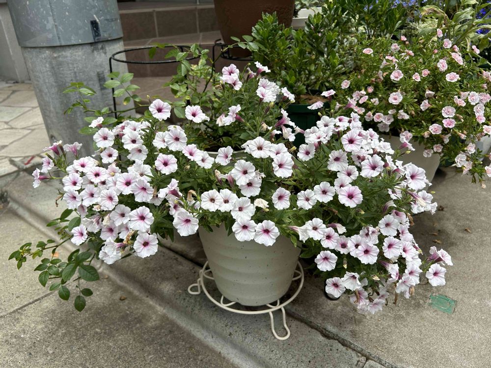 花日和さんの小輪ペチュニア・ミルキーピーチが満開です。が、我が家あるある、綺麗にまとまらず、細長く咲いています。まるでミルクウェイ…銀河…じゃなくて…あー日本語が出てこない…