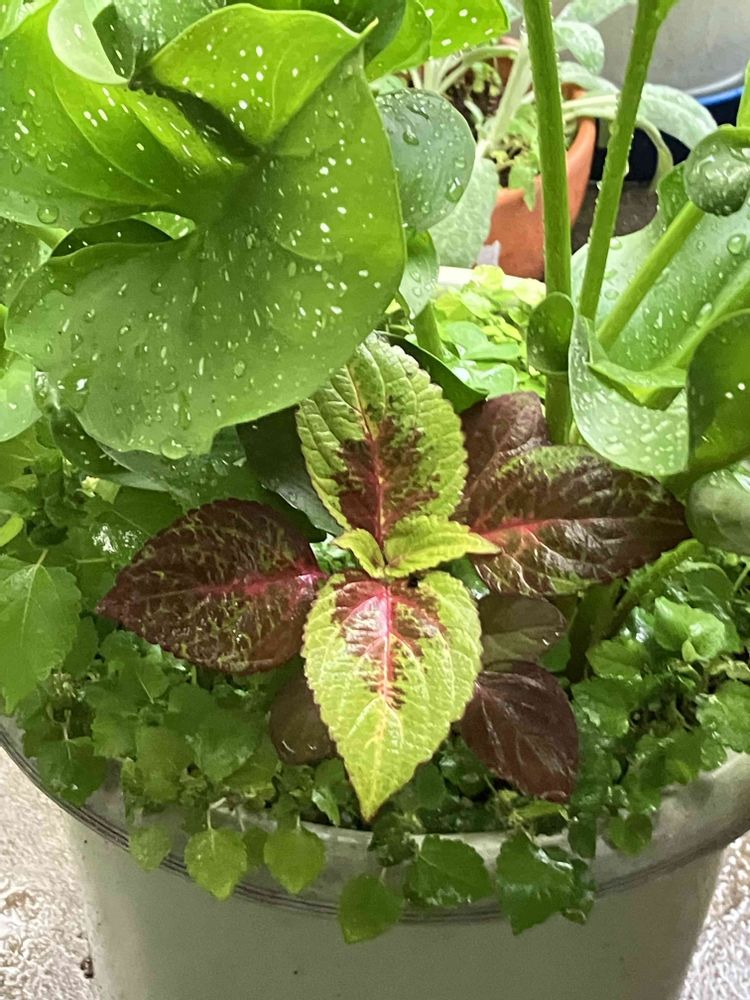 MLBを観ながらではなかなかはかどらない😆 カラーの鉢植えの隅に去年頂いたコリウスが出て来た❗️なんか🉐した気分😊