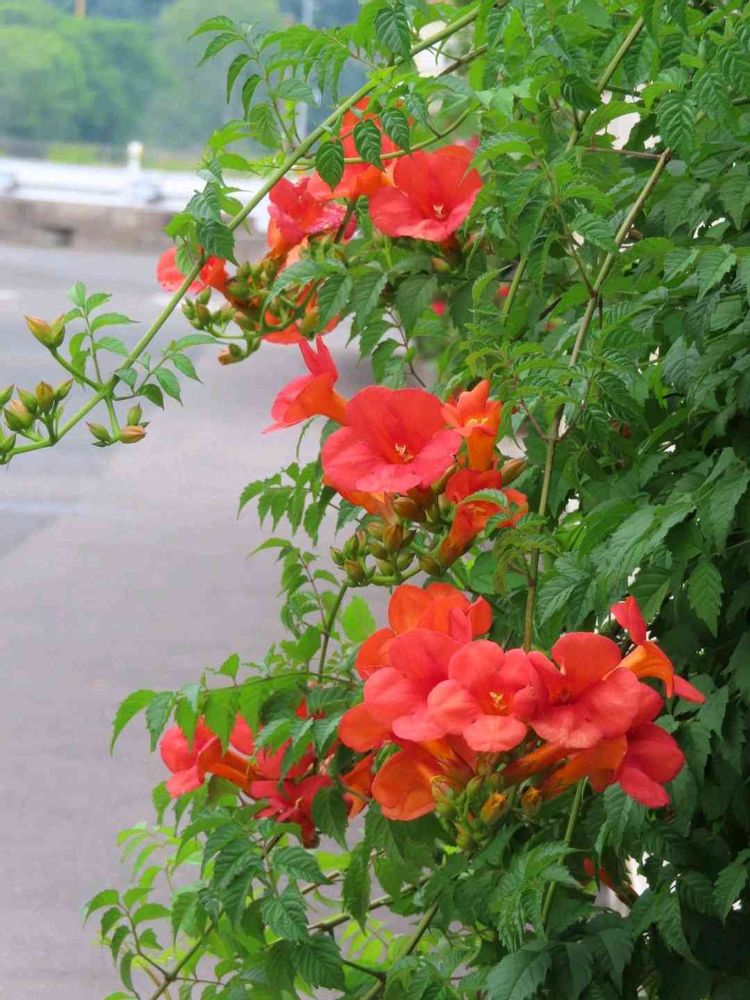 真っ赤なノウゼンカズラが鮮やかに咲き始めました。