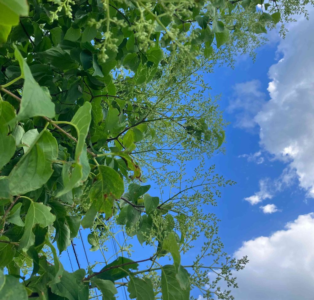 深いブルーの空と白い雲がお花と葉っぱのグリーンを引き立たせてくれていますね🤩🎶