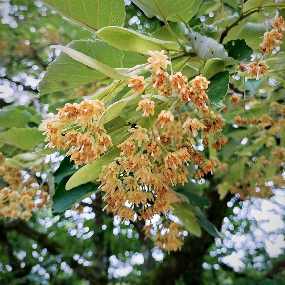 アオイ科シナノキ属の落葉高木。中国原産で寺院などに植えられる。葉は先が鋭く尖り縁に鋸歯があり、裏面に灰白色の毛が密生する。基部がやや左右非対称になるのが特徴。花期は5~6月。香りの良い淡黄色の花が長い柄の先に10〜20個ぶら下がって咲く。花弁は5枚で直径1㎝。果実は堅果。球形で表面にも毛があり秋に熟す。丸い果実の中に硬い種子が1個入る。葉に果実がつくように見えるが、葉ではなくヘラ状の総苞で、中途まで果序の柄と癒合している。総苞は1〜3個の果実をぶら下げたまま風に飛ばされ、ヘリコプターのようにくるくる回って落下する。