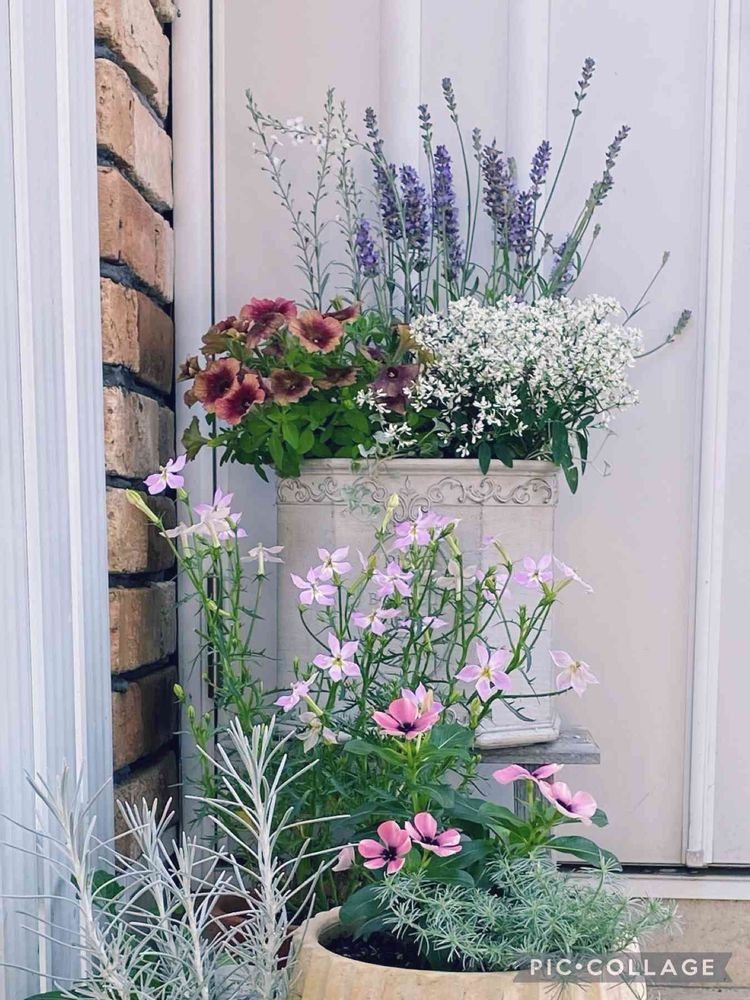 玄関前には今綺麗に咲いてるお花を置いています🤍💜🩷🍃