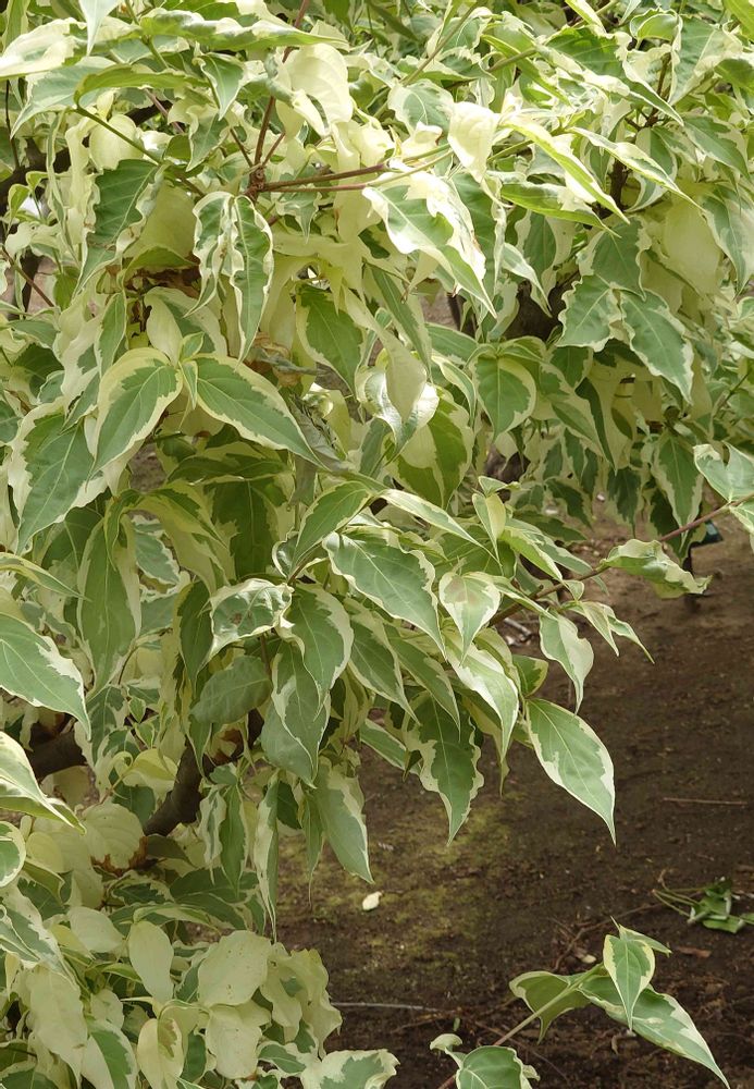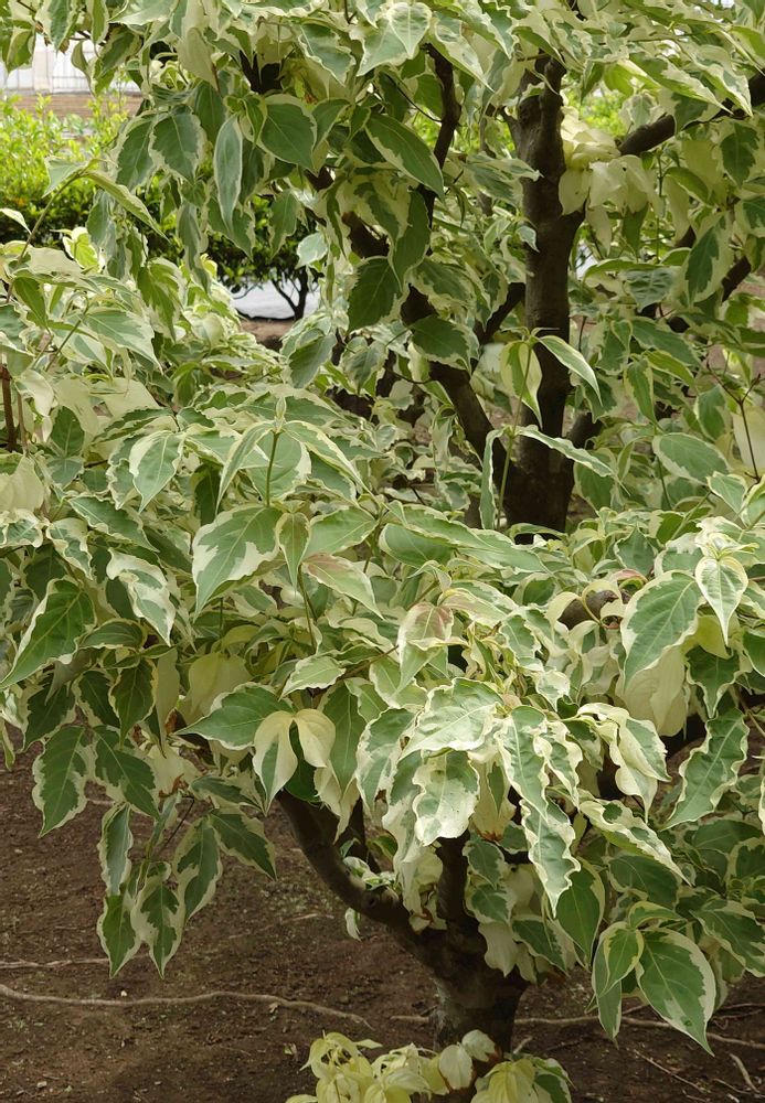 こちらも涼しげな斑入りの葉っぱが魅力ですね。「ヤマボウシ ウルフアイズ」というかっこいい名前ですが、葉っぱの形が由来なんですかね🤔 切れ長のオオカミの眼の形に似ていますよね、と、勝手に無責任解釈しました😀(農業試験場内にて)