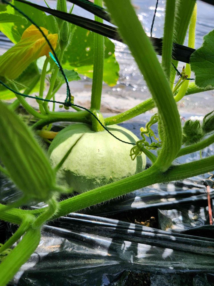 エンドウのネットをそのままに、ミニカボチャを植えたら、小さいカボチャ🎃が実りました。