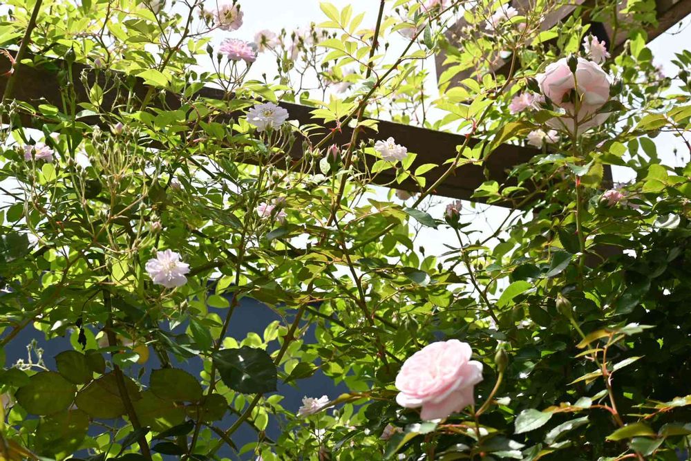 ③ フェンス外側のポールズヒマラヤンムスクが高い所まで伸びているので、内側からも見えるようになってエンジェルハートとのコラボももうすぐかな