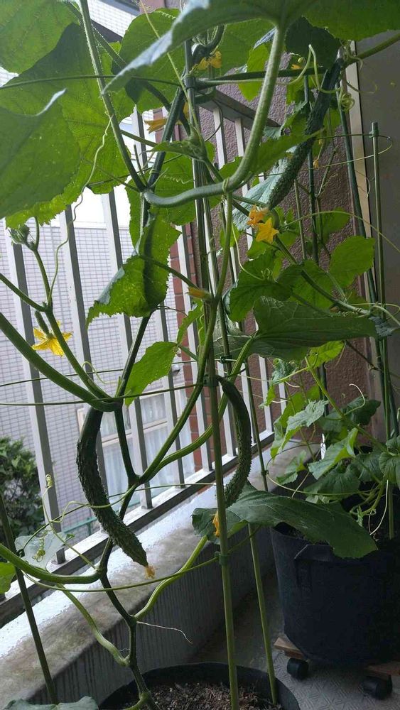 私はベランダフェンスに3本植えたが1本折ったから😂2本、1本だけ元気で1本キュウリ取ったよ一番なりは早く取らないと栄養取られるよ小さくても早く取ると後、後にも栄養が回るから沢山取れるよ