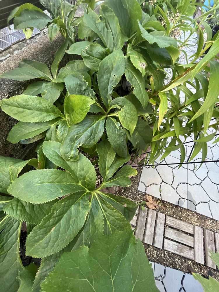 ③ヤブランの上にいるクリローの葉っぱ🍃兎に角デカイ‼️切っても良いのか‥😐⁇