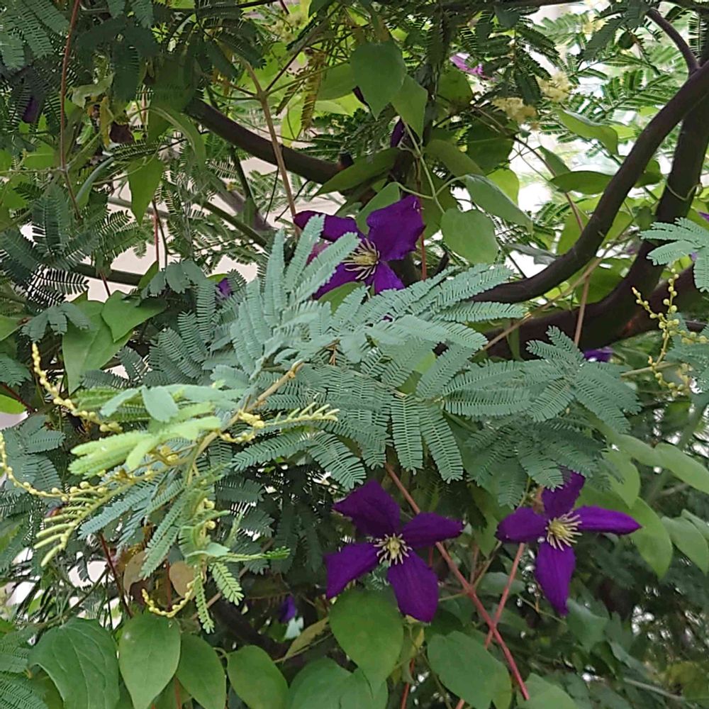 四季咲きアカシア〜今年もクレマチスに巻き付かれながら咲き始めました〜🌕🌕🌕🌿