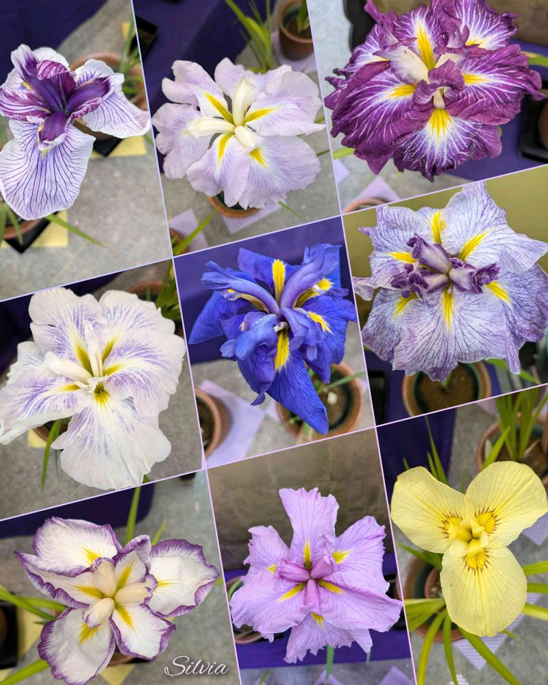 植物園での、鉢植え花菖蒲の展示場〜📷📱です〜💜🤍🩷💛💙どれも素敵な作品でした😍
