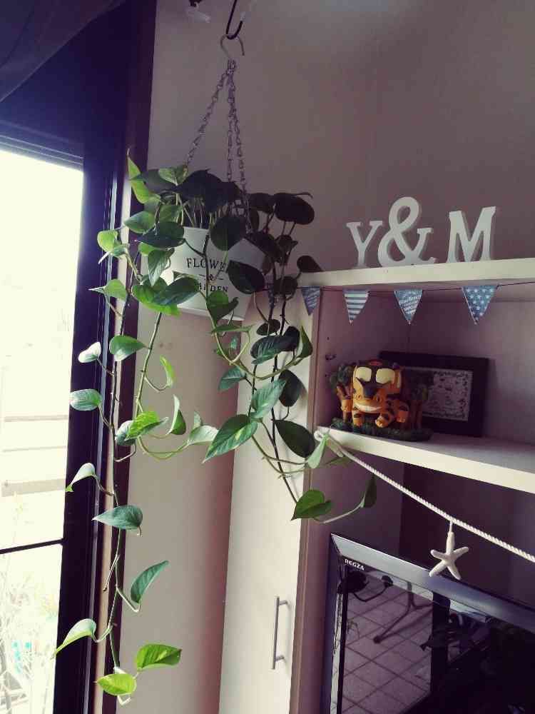 100均でお迎えしてから約1年で先日、吊り鉢に植え替えによりのびのびポトス。
