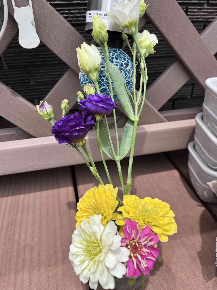 4️⃣ トルコキキョウと百日草を水差し用にカット✂️