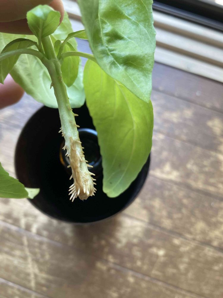 摘芯したバジルを水耕栽培で根っこ出しに再挑戦。ここまでおよそ3週間でした。