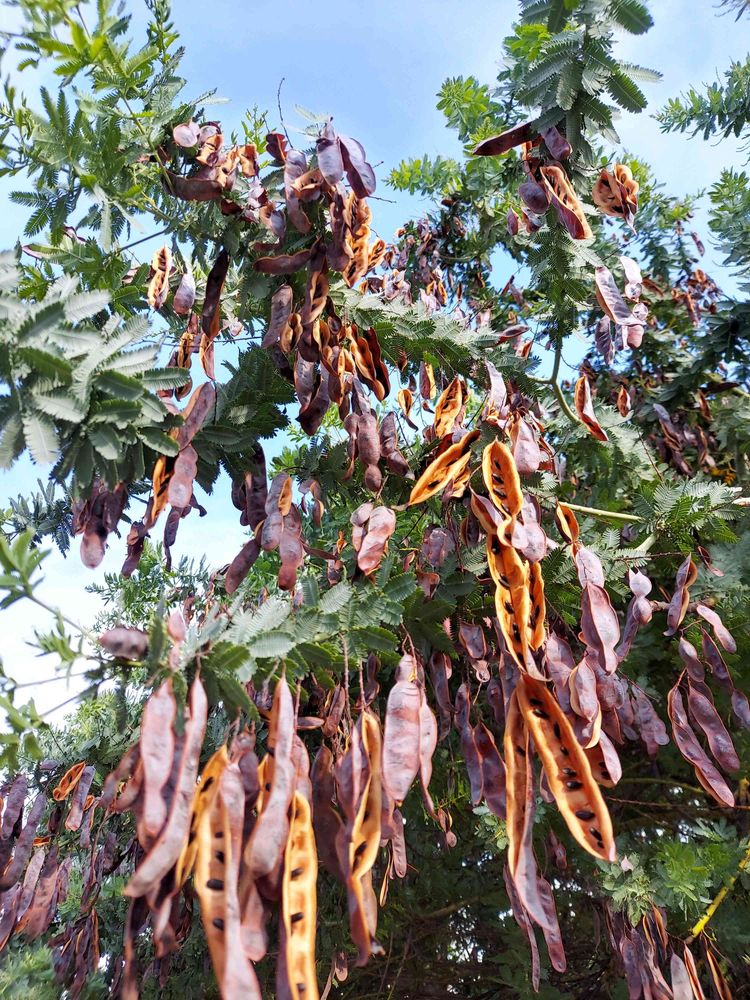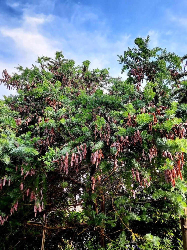 春先に庭で黄色い花を咲かせていた🟡ミモザ ギンヨウアカシアの種さやが弾けて黒い種が顔を出しています👀‼️
