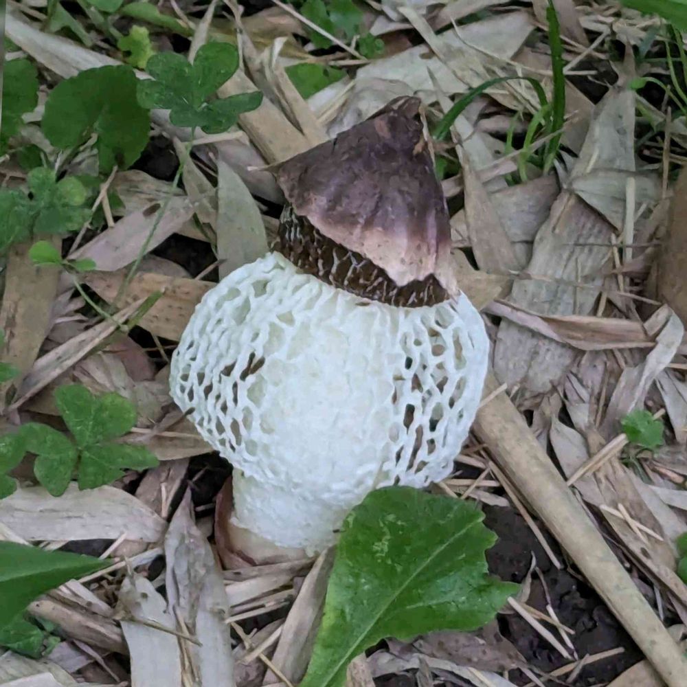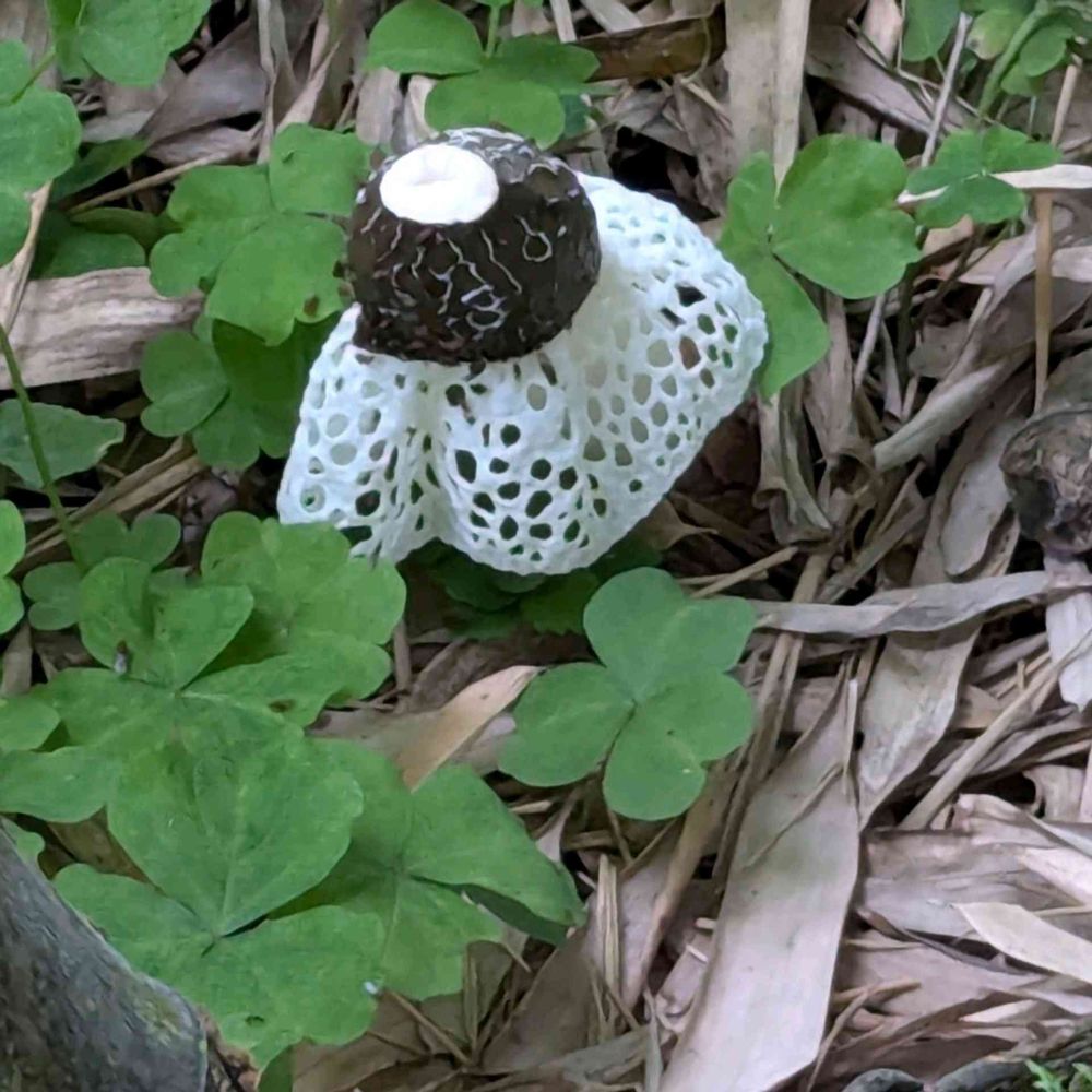 「アカダマキヌガサタケ」で、キノコの女王と呼ばれているキヌガサタケに比べるとレースのスカートも繊維は太く目が粗いそうですが、初めての出会いにテンション上がりました〜🤩💓