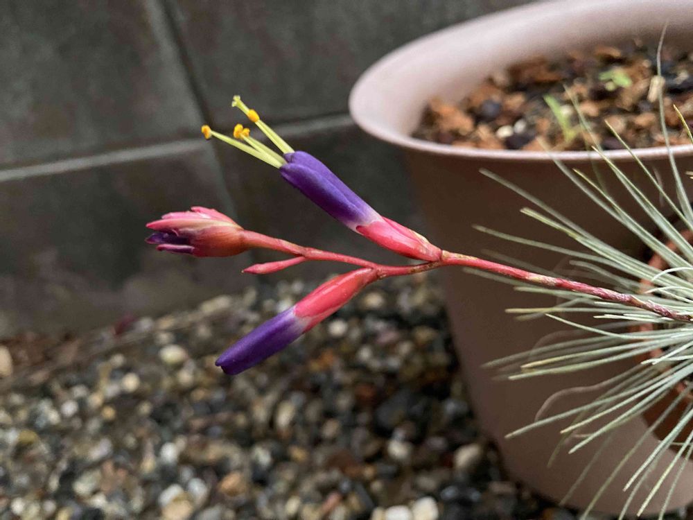 左右に伸びた赤い花芽と濃い紫色の花、黄色い雄しべの組み合わせがとても良いです🥰