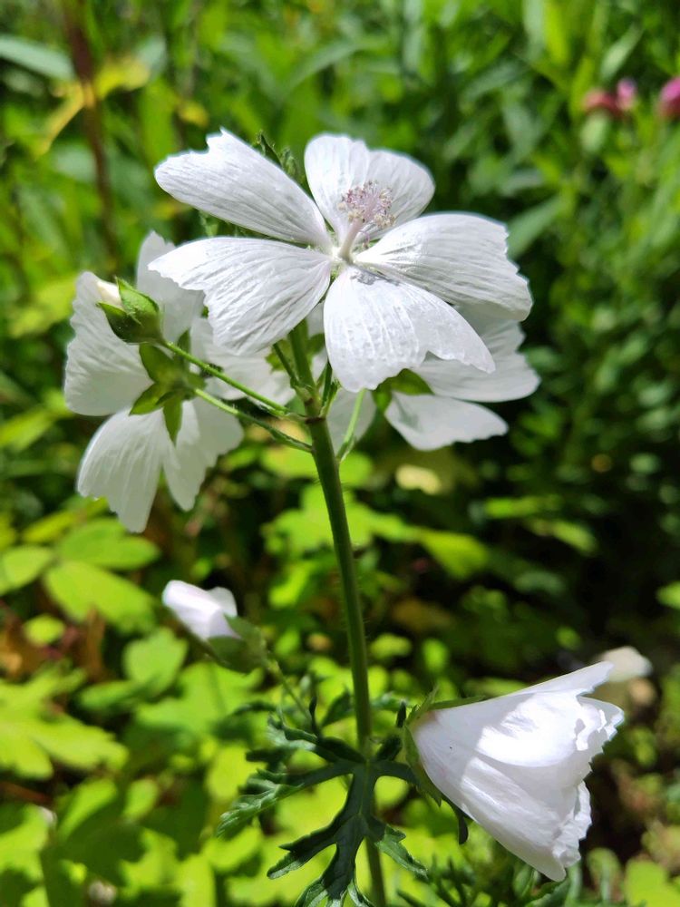 真っ白なムスクマロウ咲き始めました ピンクもあったのに今年見当たらないです 残念ですね(៸៸>⩊<៸៸)~♡