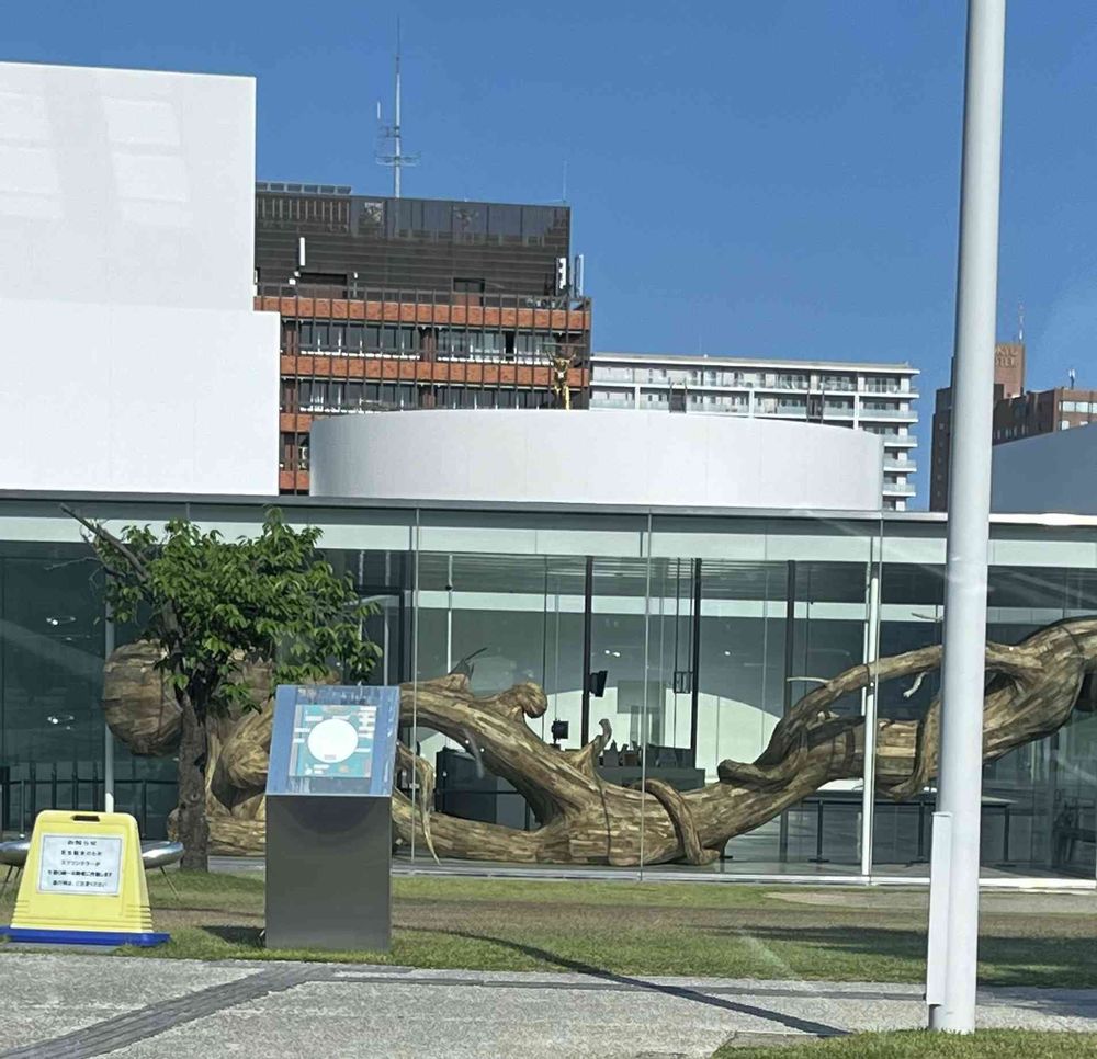 今朝の金沢21世紀美術館の広坂口、巨大な木の幹がガラスを突き抜けていました。迫力の展示です😁