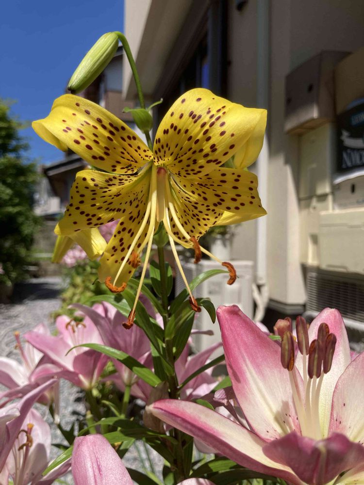 プランターに植える時球根を分けたつもりが、スカシユリの中にポツンポツンと黄金鬼ユリが咲き出しました😱分球した物が有り過ぎて仕分け間違いしたんですね💦