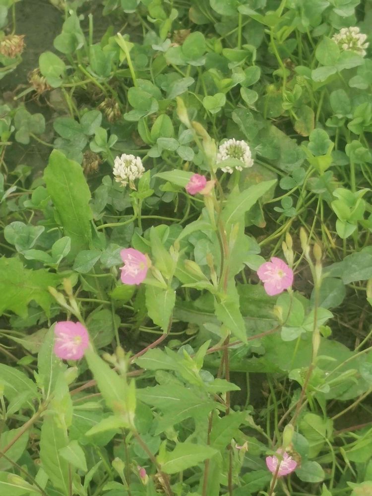 市の駐輪場にシロツメクサとユウゲショウが咲いています。🌸