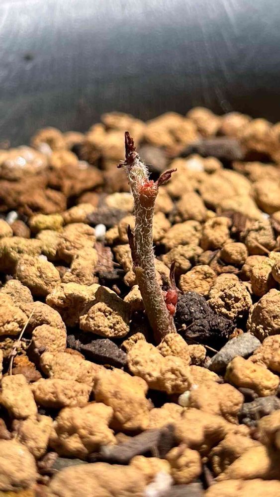 リンゴやナシはタネが開いて双葉になりますが、ツバキはまず茎が出てその後葉っぱが展開するようです。