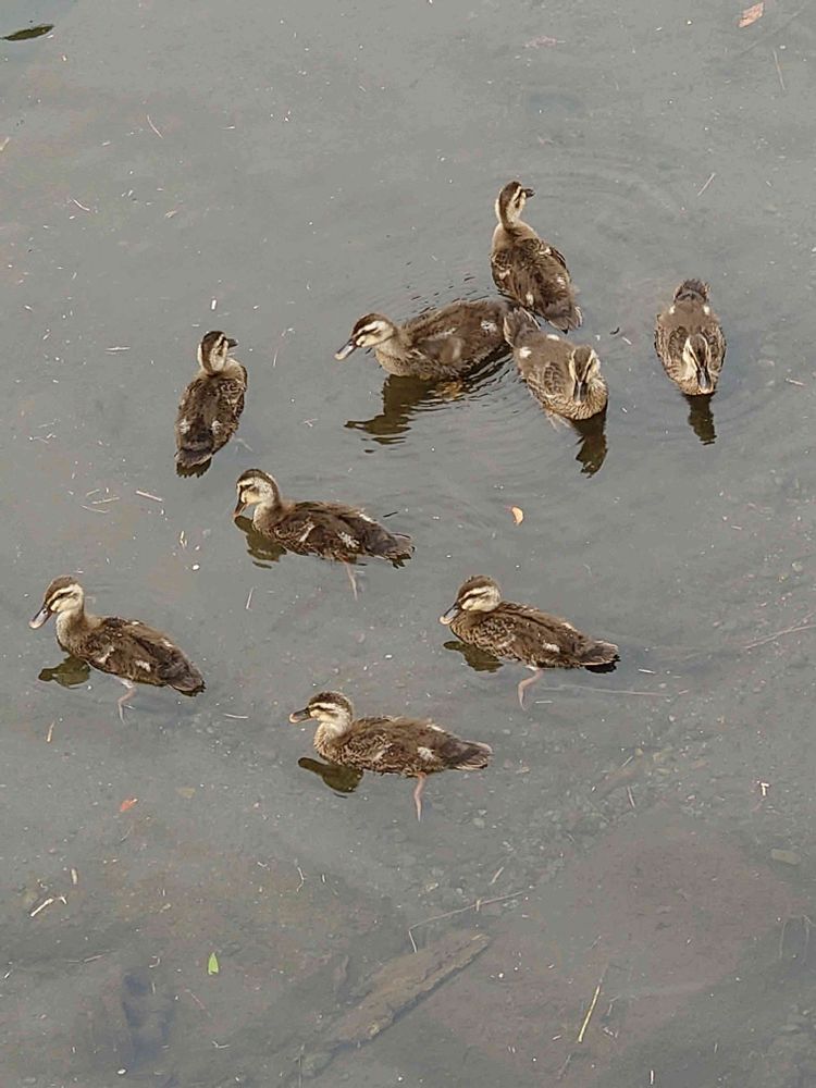 ヤマボウシをみたあと、川べりに。するとカモの大家族が向かってきました🙌 カルガモっぽいですね。子ガモをやさしく見守る親鳥の距離感がいいですね😀